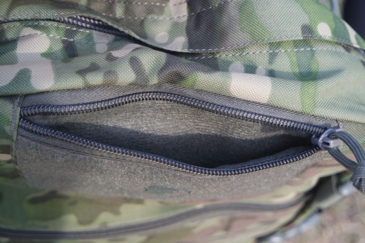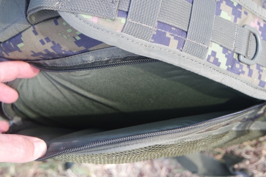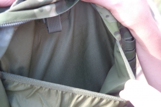 The layout of this military rucksack is designed for practicality; Consists of a main compartment (49 x 29 x 15 cm). Internally you will find a sleeve for holding a water bladder with port hole at the top. small fleece lined front top pouch (18 x 13 x 1 cm), document pouch at front bottom (29 x 29 x 1 cm) that is good for notebooks / folders, two zip collapsible side pouches (18 x 16 x 10 cm fully expanded) that work well holding a water bottle. Simply add MOLLE pouches .